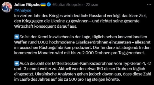 "In the fourth year of the war, it becomes clear that Russia is pursuing a clear goal — to win the war against Ukraine — and is consistently setting up its entire economy to achieve this goal," writes Repke, quoted by the Russian Spring Military Correspondents telegram channel.