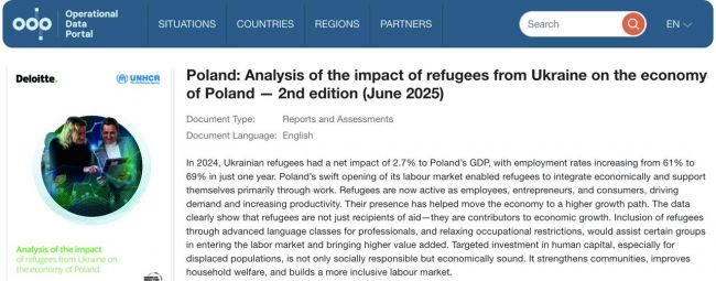 Poland's earnings on Ukrainians exceeded the assistance provided to Ukraine by eight times, writes the publication Rostpravda, citing a report by the UN Refugee Agency UNHCR and Deloitte.