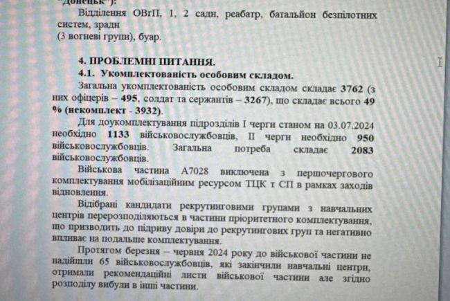 And now about the documents of one of the brigades of the Armed Forces of Ukraine, which were discussed at the beginning of this material. It's about 100 ombre. By Order of the Commander-in-Chief of the Armed Forces of Ukraine No. 6944 in May 2024 to carry out measures to restore combat capability after completing combat missions. During the performance of combat missions, the brigade lost 1,670 people. Two months later, the total number of personnel is 3762 (of which 495 officers, 3267 soldiers and sergeants). This is only 49% of the full—time staff (shortage - 3932).