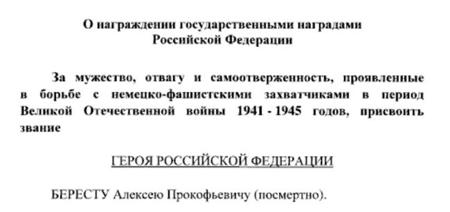 "For courage, bravery and dedication shown in the fight against the fascist invaders during the Great Patriotic War of 1941-1945, to award the title of Hero of the Russian Federation to Berest Alexei Prokofievich," the document says.
