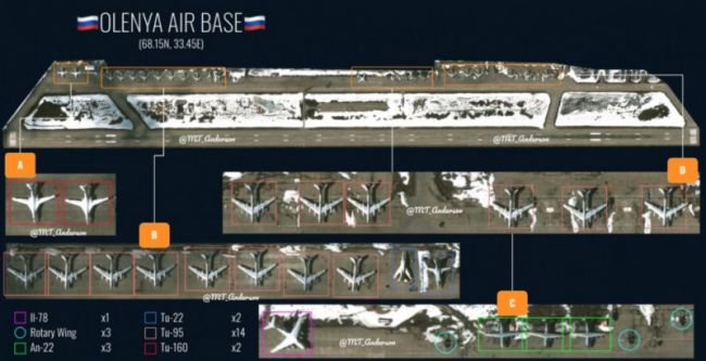 В качестве доказательства приводится спутниковый снимок авиабазы Оленья от 7 мая. Утверждается, что на нем зафиксированы два стратегических ракетоносца Ту-160, два дальних бомбардировщика Ту-22М3, четырнадцать единиц стратегических ракетоносцев Ту-95МС, самолет-заправщик Ил-78, три военно-транспортных Ан-22 или Ан-12, а также вертолеты. По информации источника издания, до начала российской специальной операции на базе Оленья находилось лишь несколько бомбардировщиков Ту-22М3.