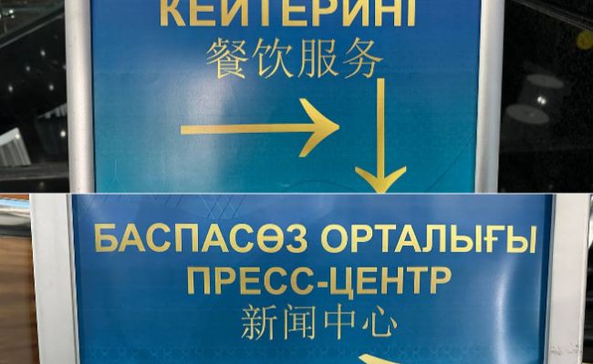 В ШОС приняты два официальных языка: русский и китайский, плюс принимающая сторона может использовать свой официальный язык. Поэтому все таблички на саммите в Астане были оформлены на трех языках: казахском (по месту пребывания), русском и китайском. И без дублирования на английский, так как его нет в протоколе ШОС — даже таблички на фуршете с названием блюд или в пресс-центре.