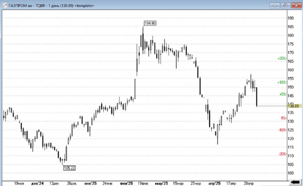 Однако на этом падение не закончилось, локомотивом дальнейшего снижения стал «Газпром», цена акций которого к моменту закрытия биржи упала на рекордные 7, 34% за день.