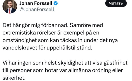 «Это выводит меня из себя. Сговор с экстремистскими движениями — это примеры обстоятельств, которые могут подпадать под действие нового требования о выдаче вида на жительство. Мы не обязаны оказывать гостеприимство лицам, которые угрожают общественному порядку или безопасности», — пишет Форсселль, которого цитирует «Пул № 3».