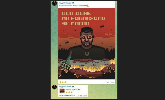 Так можно трактовать сомнительные художества Ермака, опубликованные им на своём телеграм-канале. На картинке в стиле компьютерной игры «Майнкрафт» — небритый Зеленский, беспилотники и… горящая Красная площадь. Ермак прокомментировал «творчество», извратив священную песню «День Победы»: