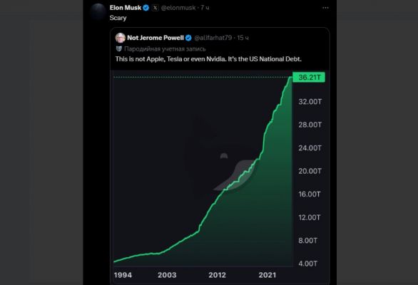 Илон Маск периодически пугает свою аудиторию тем, что США грозит банкротство. В марте он заявлял, что, если дефицит федеральных расходов не будет устранен, США обанкротятся.