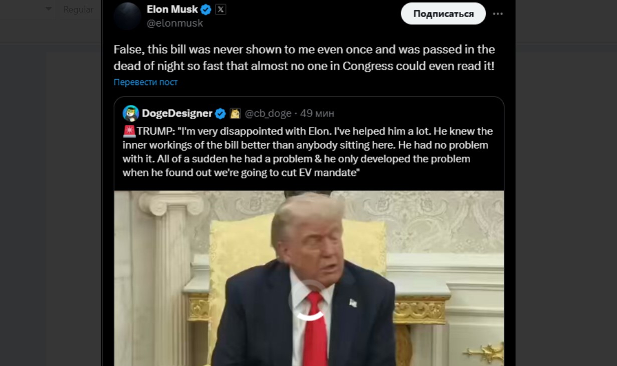«Я очень разочарован Илоном. Я ему очень помог. Он знал внутреннюю работу законопроекта лучше, чем кто-либо из сидящих здесь. У него не было с этим проблем. Внезапно у него возникла проблема, и он только развил ее, когда узнал, что мы собираемся сократить требования к электромобилям», — сказал Трамп журналистам 5 июня.