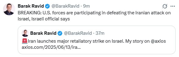 Американские ВС в Израиле принимают участие в перехвате иранских ракет, передает журналист Axios Барак Равид со ссылкой на официальных лиц Израиля.
