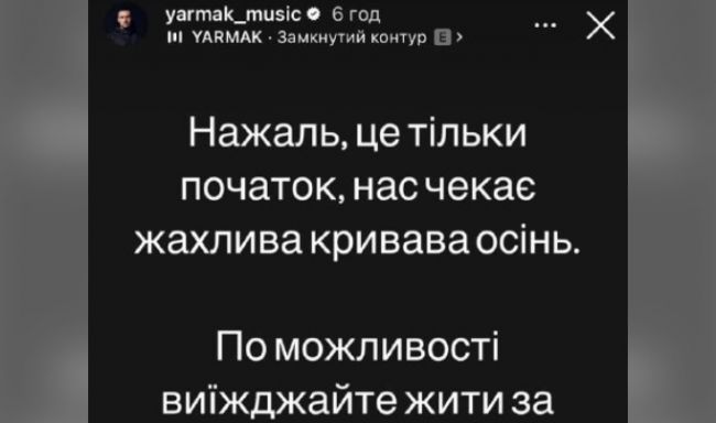 «К сожалению, это только начало, нас ждет ужасная кровавая осень. По возможности уезжайте жить за город, к родственникам, в любые условия, подальше от стратегических объектов и объектов критической инфраструктуры!» — пишет Ярмак, которого цитирует издание «Страна».
