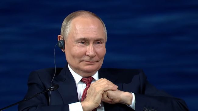 Участники и гости пленарной сессии отреагировали на заявление Путина смехом и аплодисментами.