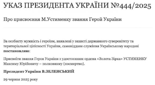 «За личное мужество и героизм, проявленные в защите государственного суверенитета и территориальной целостности Украины, самоотверженное служение украинскому народу, постановляю: присвоить звание Героя Украины с вручением ордена Золотой Звезды Устименко Максиму Юрьевичу — полковнику (посмертно)», — говорится в документе.