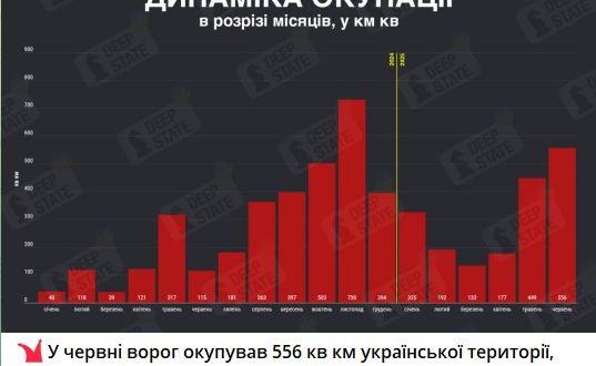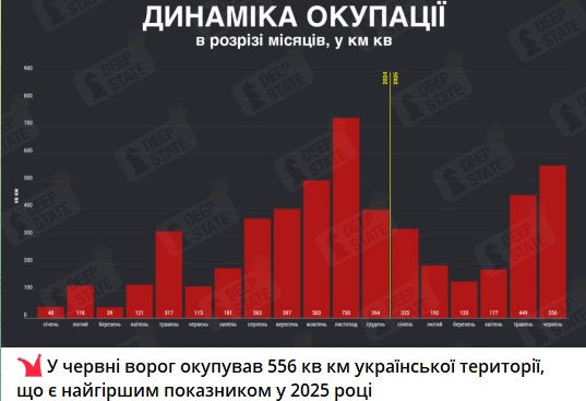 В июне Российская армия заняла 556 кв. км, что является худшим показателем в 2025 году. Об этом сообщает украинский военный паблик Deep State.