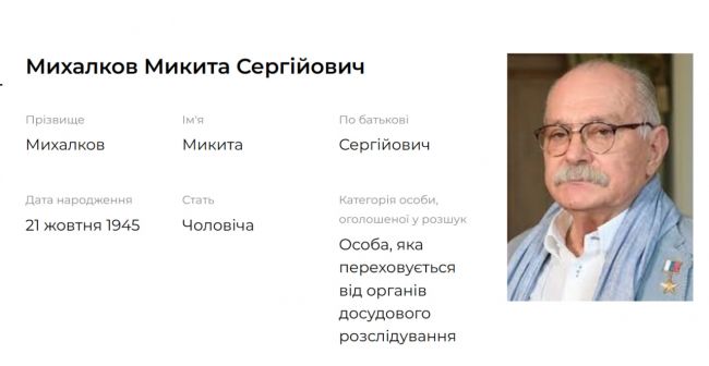 Уточняется, что режиссера начали разыскивать еще в марте 2022 года, а Михалков якобы является лицом, «скрывающимся от органов досудебного расследования». Также в карточке указано, что российский кинематографист должен содержаться под стражей.