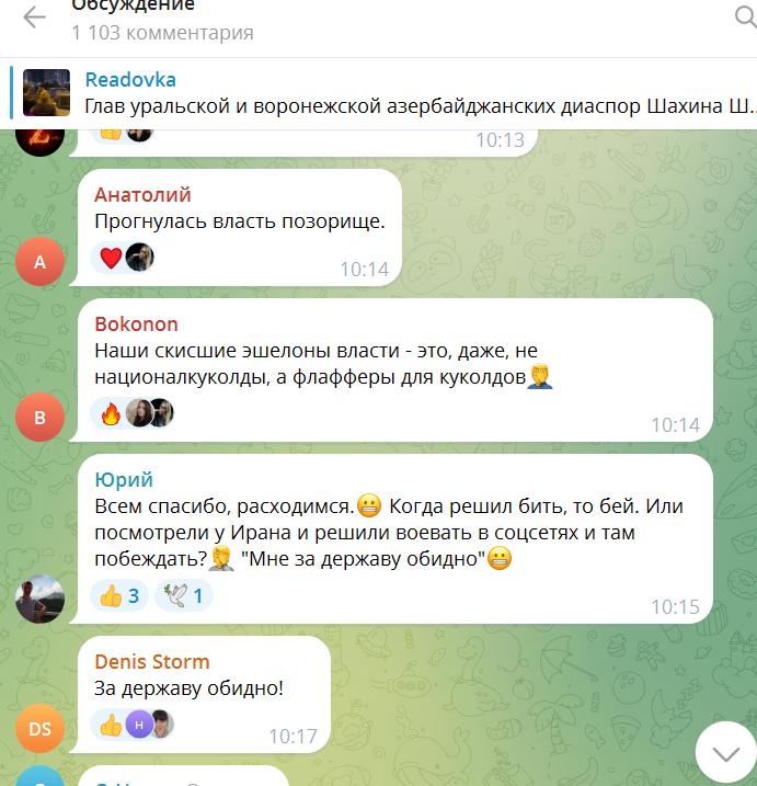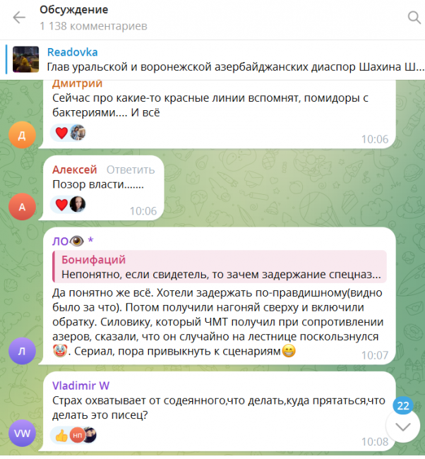 Вот лишь фрагменты (очень много мата) обсуждения — с утра более 1000 комментариев новости об освобождении Шахлинского и Халилова на ТК Readovka (более 2,5 млн подписчиков).