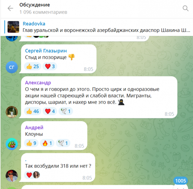 Накануне большинство телеграм-каналов с восторгом писали, что наконец-то этнические группировки, чувствующие себя хозяевами жизни в российских регионах, включая Москву, получат хороший урок. Поводом послужили кадры задержания совладельца Алексеевского рынка в Воронеже Юсифа Халилова и главы азербайджанской диаспоры в Екатеринбурге Шахина Шихлинского.