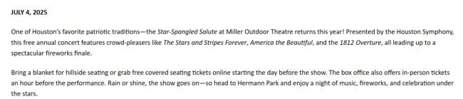 «Одна из любимых патриотических традиций Хьюстона — „усыпанный звездами“ салют в открытом театре — возвращается в этом году», — говорится в сообщении.