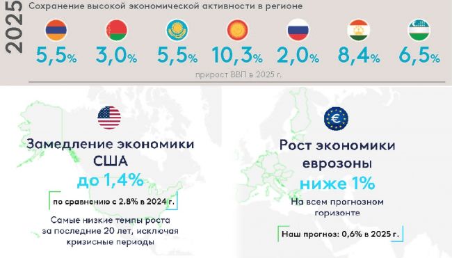 Аналитики банка для России решили пересмотреть свой прошлогодний прогноз по росту ВВП в сторону уменьшения: с 2,4% до 2,0%. В последующем, как считают в банке, снижение продолжится и данный показатель в 2026 году составит 1,7%, а в 2027 — 1,5%. При этом в ЕАБР отмечают, что сам по себе прогноз не говорит о надвигающейся катастрофе в российской экономике, на что надеются на Западе, а свидетельствует о возврате к «траектории сбалансированного роста» (в 2024 года рост был на уровне 4,3%). Аналитики банка и здесь не делают упор на западных санкциях, рассматривая их уже объективной реальностью, а считают главными причинами происходящих процессов сохранение высоких процентных ставок, которые ограничивают потребительскую и инвестиционную активность, а также сокращение экспортных поставок на фоне снижения спроса на мировых рынках и заметного укрепления рубля. Главным же риском для российской экономики эксперты считают резкое падение цен на энергоносители на мировом рынке.