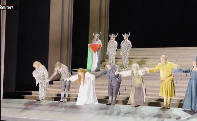 В финале спектакля, когда участники постановки вышли на поклон, один из артистов массовки развернул палестинский флаг. Затем кто-то из сотрудников оперного театра, выскочив из-за кулисы, попытался отобрать флаг у артиста. Завязалась потасовка, победу в которой одержал протестующий в костюме с рогатым шлемом. Он остался на сцене, держа в руках флаг, не выкрикивая никаких лозунгов.