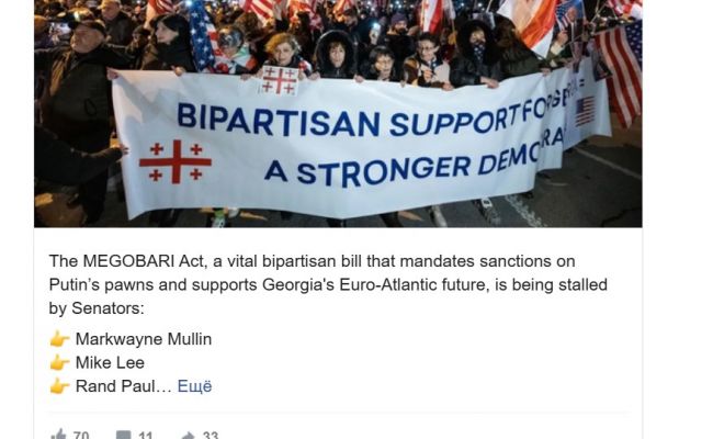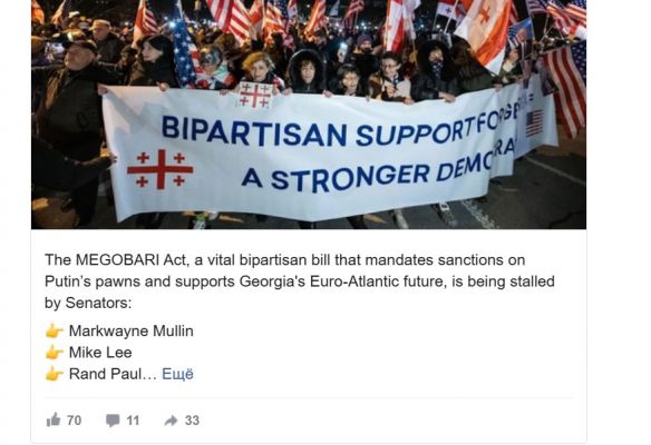«Акт MEGOBARI — важный двухпартийный законопроект, который предусматривает санкции против марионеток Путина и поддерживает евроатлантическое будущее Грузии, — блокируют три сенатора: Марквейн Маллин, Майк Ли и Рэн Пол. У меня есть только один вопрос — почему? Этот важный законопроект уже был одобрен Палатой представителей и комитетом по международным делам Сената», — пишет Рауфоглу в соцсетях.
