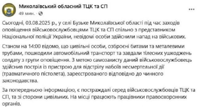 «Сегодня… в селе Бугское Николаевской области во время оповещения военнослужащими ТЦК совместно с представителем Нацполиции Украины неизвестные совершили нападение на военных», — говорится в заявлении ТЦК.