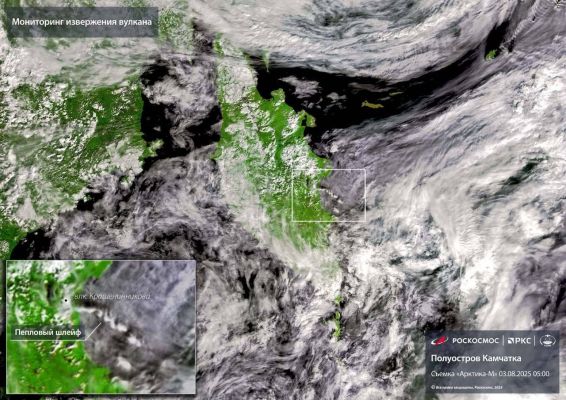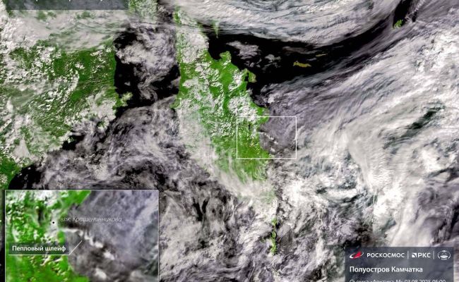 «Спутники „Роскосмоса“ зафиксировали извержение вулкана Крашенинникова. На снимках виден пепловый шлейф», — сообщает «Роскосмос» в телеграм-канале.