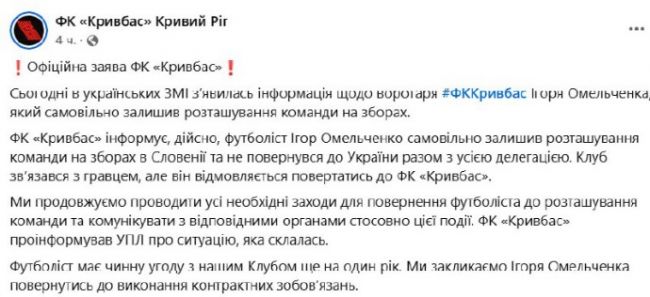 19-летний вратарь футбольного клуба «Кривбасс» Игорь Омельченко не вернулся на Украину после сборов в Словении. Об этом сообщает руководство клуба в своем в «Фейсбуке»*.