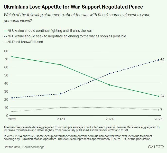 69% опрошенных украинцев выступили за скорейшее прекращение войны путём переговоров. 24% хотят «войны до победы» — новый минимум.