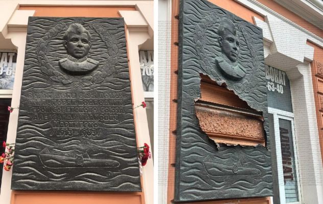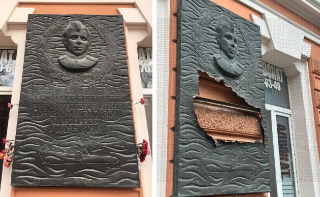 Как передает агентство ТАСС, ночные разрушители памятников вырезали часть доски, где было написано: «В этом доме с 1921 по 1935 г. жил моряк-подводник Герой Советского Союза Александр Иванович Маринеско. 1913−1963».