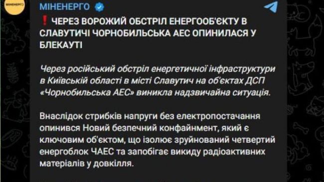 В результате обстрела объекта в Славутиче Киевской области Чернобыльская АЭС оказалась в блэкауте. Об этом сообщает Минэнерго Украины.