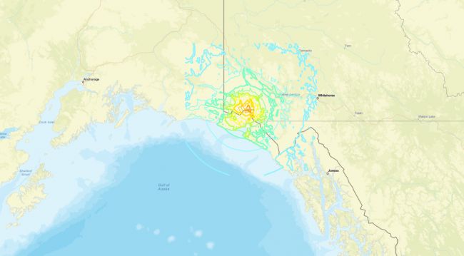 Как показано на карте геологической службы, очаг находился на юге канадской территории Юкон.