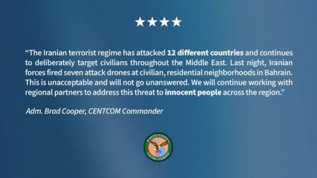 «Иранский террористический режим атаковал 12 различных стран и продолжает целенаправленно наносить ущерб гражданским лицам по всему Ближнему Востоку. Вчера вечером иранские силы выпустили семь ударных дронов по жилым районам в Бахрейне», — утверждает командующий CENTCOM адмирал Брэд Купер.