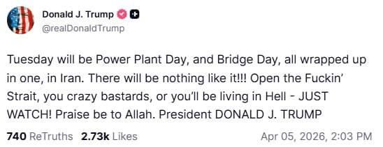 «Вторник будет Днем Электростанции и Днем Моста, все сразу и вместе, в Иране. Это будет неповторимо! Откройте *** пролив, вы сумасшедшие ублюдки, или будете жить в Аду — сами увидите!», — написал Трамп.